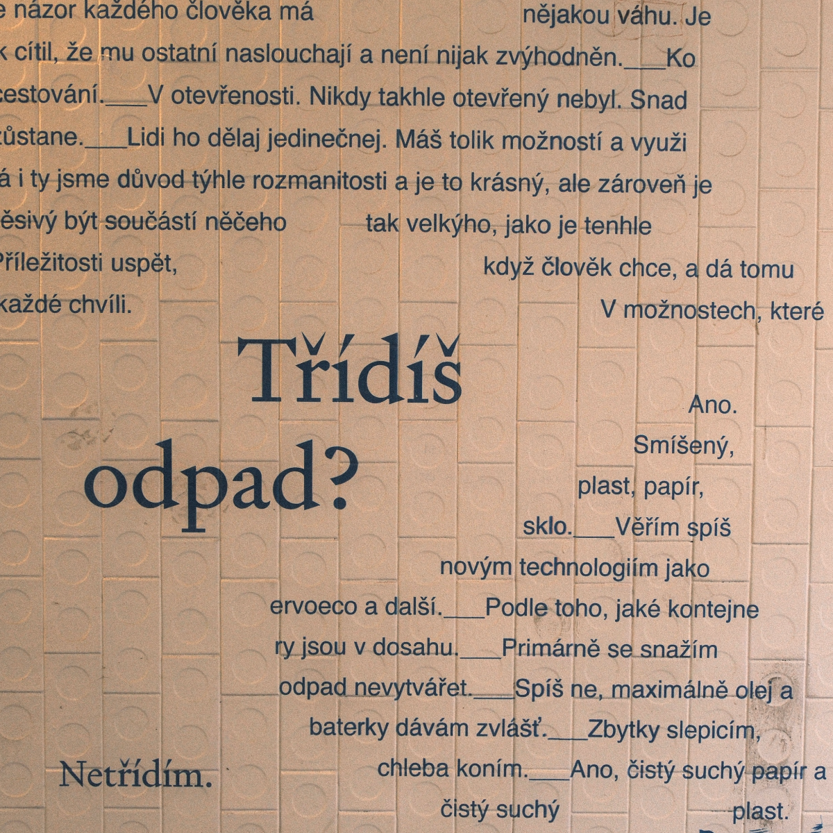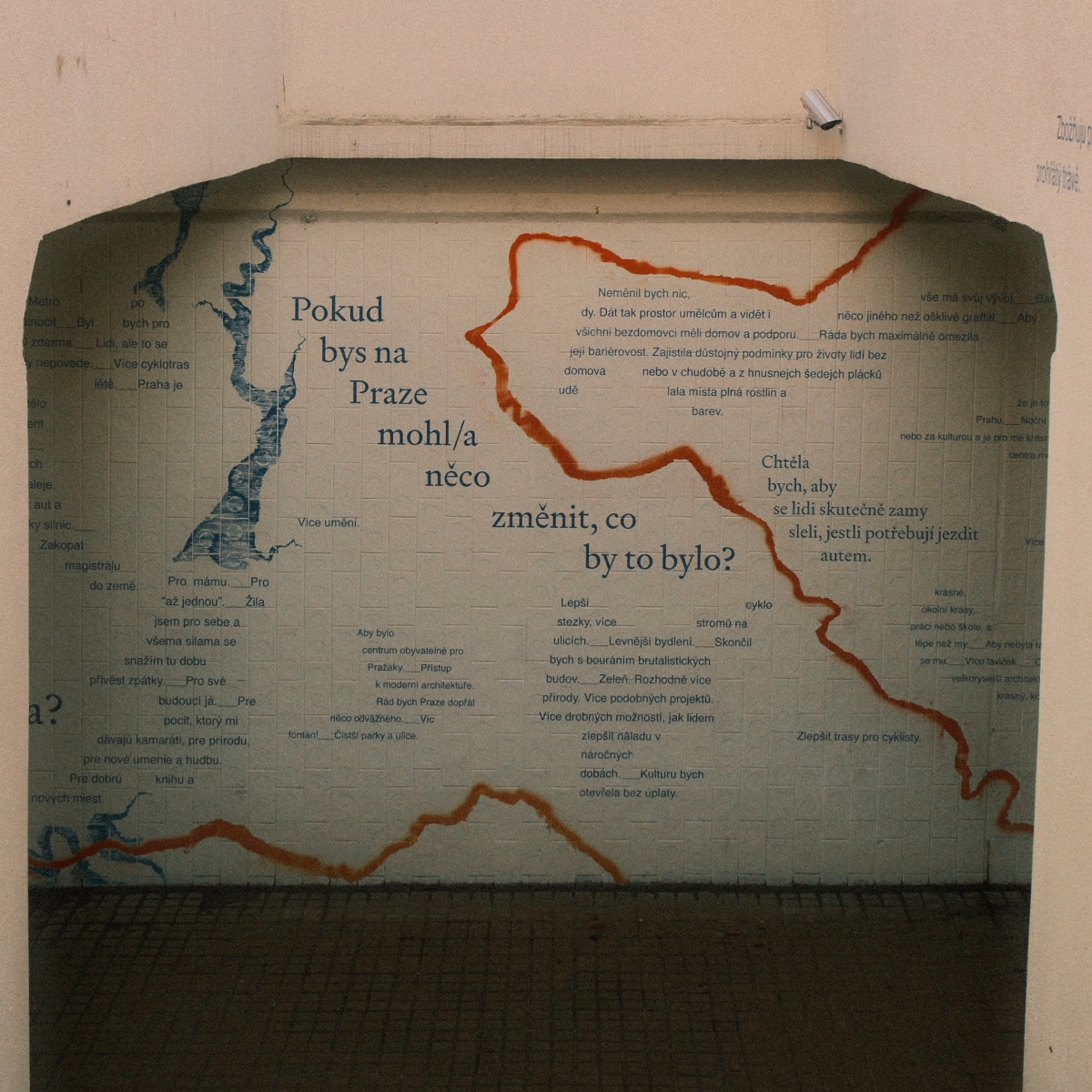 PRAHO! project od svého začátku ušel dlouhou cestu. Od sbírání poezie umístěné – nejen – do veřejného prostoru města, přes vydání čtyřdílné PRAHO! publikace až po menší či větší instalace a výstavy po celé Praze, jsme se za necelý rok a půl usilovné práce dostali do nové fáze. Po měsících usilovného vyjednávání se nám totiž podařilo navázat spolupráci s TSK, Umění pro město, AVU a městskou částí Praha 8, jež finančně zaštítili naši vůbec první permanentní realizaci v Praze, a to konkrétně podchod pod tramvajovou zastávkou Vychovatelna.